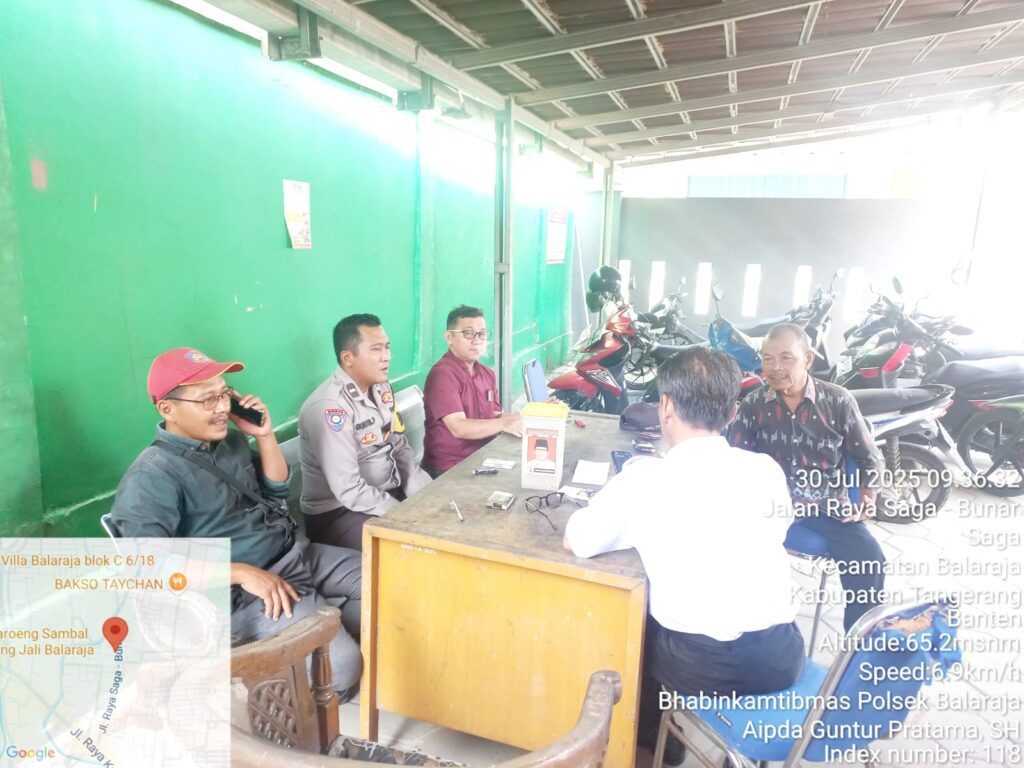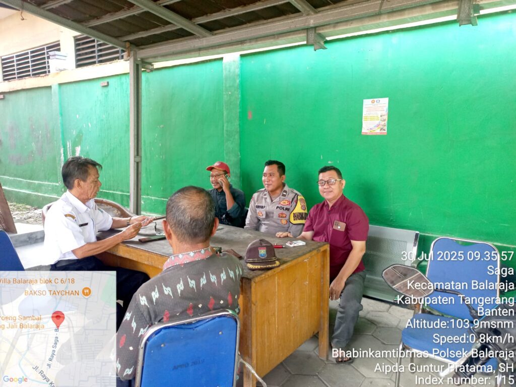 Suara62.id || Kabupaten Tangerang – Bhabinkamtibmas Polsek Balaraja Aipda Guntur P. Melaksanakan Sambang DDS dan Silaturahmi kepada Tokoh Masyarakat Bpk Dayim S. Kejaroan 2 Desa Saga dan Staf beserta Masyarakat di Kantor Desa Saga Kecamatan Balaraja Kab. Tangerang. Rabu (30/07/2025).