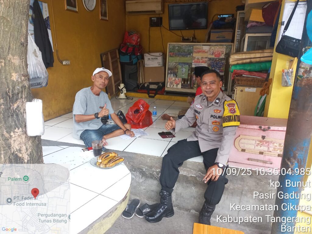 Suara62.id || Kabupaten Tangerang – Dalam upaya mempererat kedekatan dengan masyarakat sekaligus menjaga kondusivitas wilayah, Bhabinkamtibmas Desa Pasir Gadung Polsek Cikupa, Aipda Dieko A, melaksanakan kegiatan sambang ke rumah Ketua RT 01/02, Mario, di Kampung Bunut, Desa Pasir Gadung, Kecamatan Cikupa, Kabupaten Tangerang, Rabu (10/9/2025) pukul 10.40 WIB.