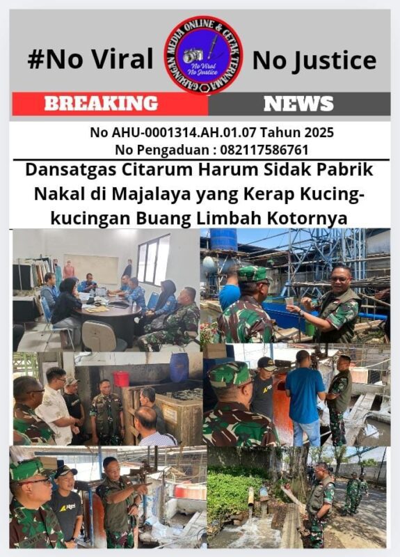 Suar62.id || Kab. Bandung, GMOCT (Gabungan Media Online dan Cetak Ternama) – Komandan Satuan Tugas (Dansatgas) Citarum Harum, Kol. Inf. Yanto Kusno Hendarto, S.H., bersama Komandan Sektor 1 Citarum Harum, Kol. Inf. Kristianto, S.E., melakukan inspeksi mendadak (sidak) ke sejumlah pabrik di Majalaya pada Senin, 10 November 2025, bertepatan dengan Hari Pahlawan. Sidak ini dilakukan menyusul laporan warga terkait pembuangan limbah berwarna hitam ke aliran anak Sungai Citarum. Informasi ini diperoleh GMOCT dari media online Sinarsuryanews.com.