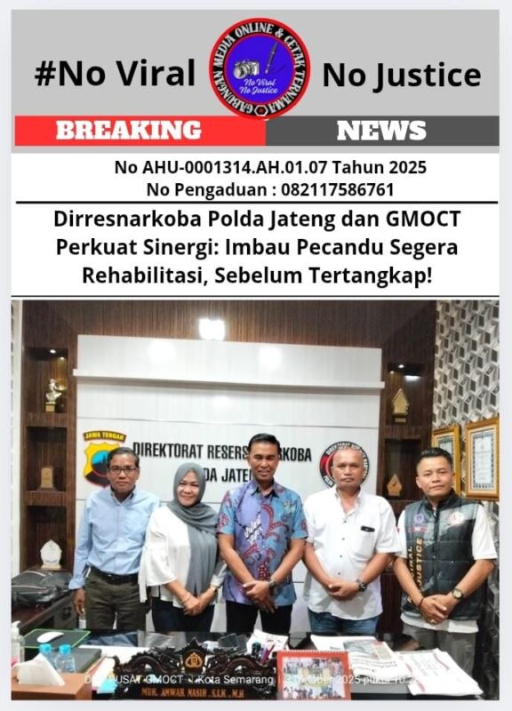 Suara62.id || Semarang, 3 Oktober 2025 (GMOCT) – Upaya pemberantasan narkoba di Jawa Tengah kembali mendapat energi baru. Direktur Reserse Narkoba (Dirresnarkoba) Polda Jateng, Kombespol Muhammad Anwar Nasir, S.I.K., M.H., menyambut hangat kunjungan jajaran Gabungan Media Online dan Cetak Ternama (GMOCT) yang dipimpin Sekretaris Umum Asep NS dan Ketua DPD Jateng M Bakara, Jumat (3/10/2025) di Gedung Resnarkoba Polda Jateng.
