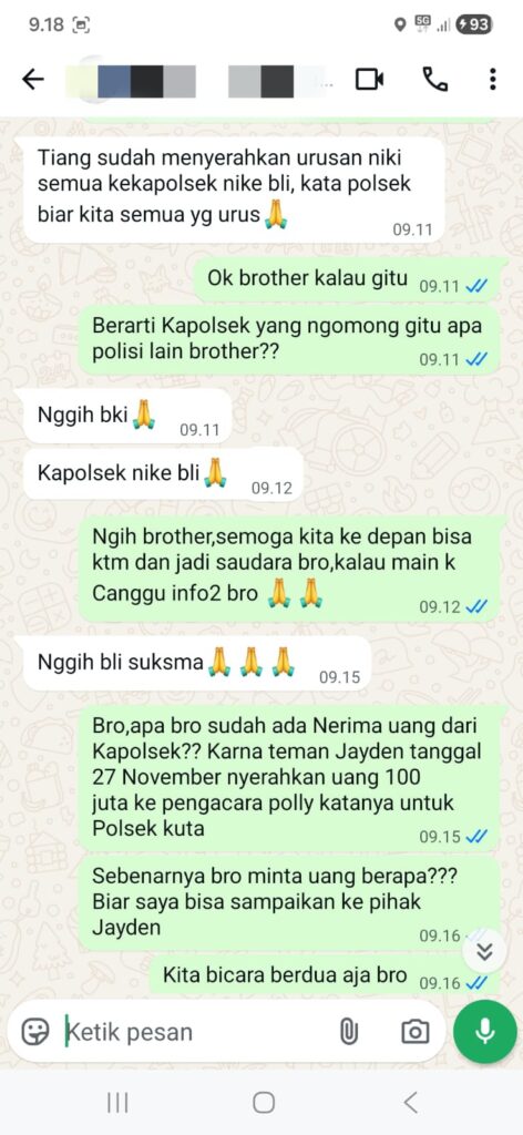 Pada 26 November 2025, Polly disebut menyampaikan kepada Brett bahwa uang Rp100.000.000 akan diberikan kepada “oknum Polsek Kuta”. Tujuannya agar Jayden Walker bisa menghubungi keluarganya di New Zealand.