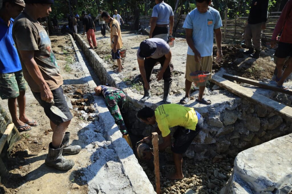 Meski terik matahari menyengat, semangat gotong royong antara personel TMMD dan masyarakat tidak surut. Mereka tampak antusias mencampur adukan semen secara manual dan menata pondasi drainase dengan penuh semangat.