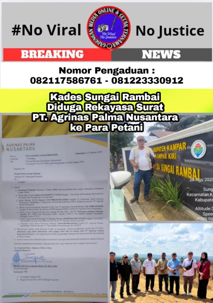 Sementara, Kepala Desa Sungai Rambai, Dedi Kandar SY, saat dikonfirmasi Awak Media melalui pesan chat WhatsApp pada Senin (27/10/2025) pagi, mengatakan, bukan hanya Kepala Desa Sungai Rambai saja yang mendapatkan surat dari PT. Agrinas Palma Nusantara. Ada 7 desa yaitu, Desa 4 Koto Setingkai, Sungai Rambai, Sungai Raja, Sungai Sarik, Sungai Harapan dan Desa Padang Sawah.