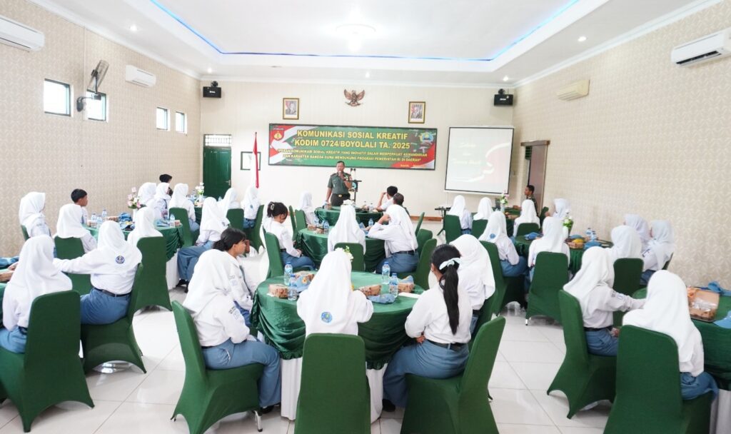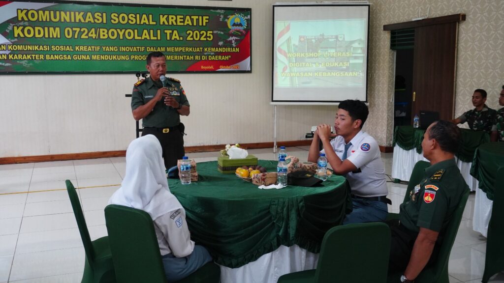 Kegiatan yang mengusung tema “Peran Komunikasi Sosial Kreatif yang Inovatif dalam Memperkuat Kemandirian dan Karakter Bangsa Guna Mendukung Program Pemerintah RI di Daerah” ini berlangsung di Aula Makodim 0724/Boyolali, Jl. Padanaran, Desa Tegalmulyo, Kecamatan Mojosongo, Kabupaten Boyolali, Rabu (29/10/25).