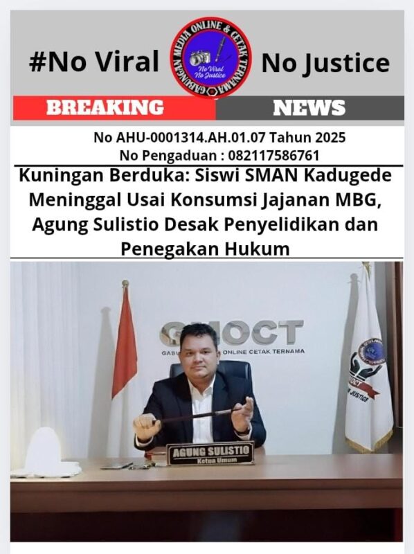 Suara62.id || Kuningan (GMOCT) – Kabar duka menyelimuti dunia pendidikan di Kabupaten Kuningan. Novi, seorang siswi kelas 3 SMAN Kadugede, meninggal dunia setelah diduga mengalami keracunan akibat mengonsumsi jajanan MBG (nama jajanan disamarkan). Peristiwa tragis ini terjadi pada Kamis, 16 Oktober 2025, dan langsung memicu reaksi keras dari berbagai pihak.