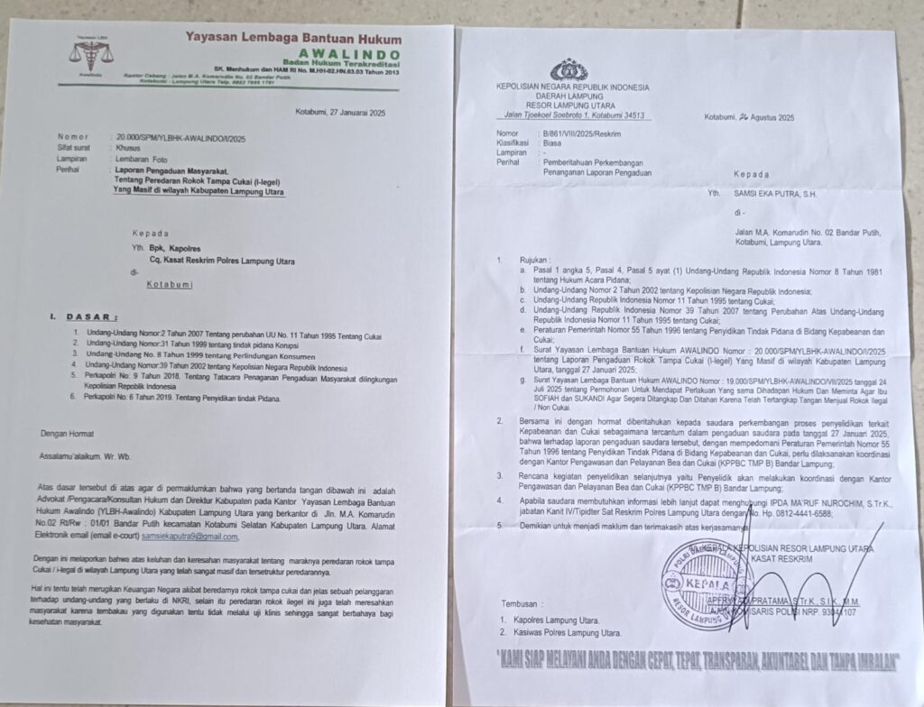 Dimana dalam pemberitaan tersebut Satreskrim Polres Lampung Utara sangat lamban merespon dan mindaklanjuti pengaduan masyarakat (DUMAS) yang dibuat oleh LBH Awalindo. Terkait adanya distributor pengedaran rokok ilegal/ Non Cukai oleh Toko ibuk Sofiah di wilayah Pasar Senen Desa Negara Ratu Kecamatan Sungkai Utara Kabupaten Lampung Utara.
