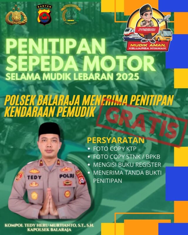 Suar62.id || KABUPATEN TANGERANG – Layanan penitipan kendaraan baik Roda dua.maupun.Kendaraan roda empat yang kebetulan tidak dibawa mudik dan khawatir jadi incaran kriminalitas, silahkan titipkan kepada Kantor Polsek Balaraja Polresta Tangerang.