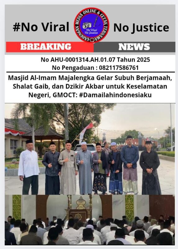 Suara62.id || Majalengka (GMOCT) 31 Agustus 2025 – Masjid Al-Imam Majalengka menjadi pusat kegiatan spiritual pada Minggu, 31 Agustus 2025, dengan digelarnya acara Subuh Berjamaah, Shalat Gaib, dan Dzikir Akbar yang bertujuan untuk memohon keselamatan dan persatuan bangsa. Acara ini dihadiri oleh berbagai elemen masyarakat, tokoh agama, serta perwakilan pemerintah daerah.