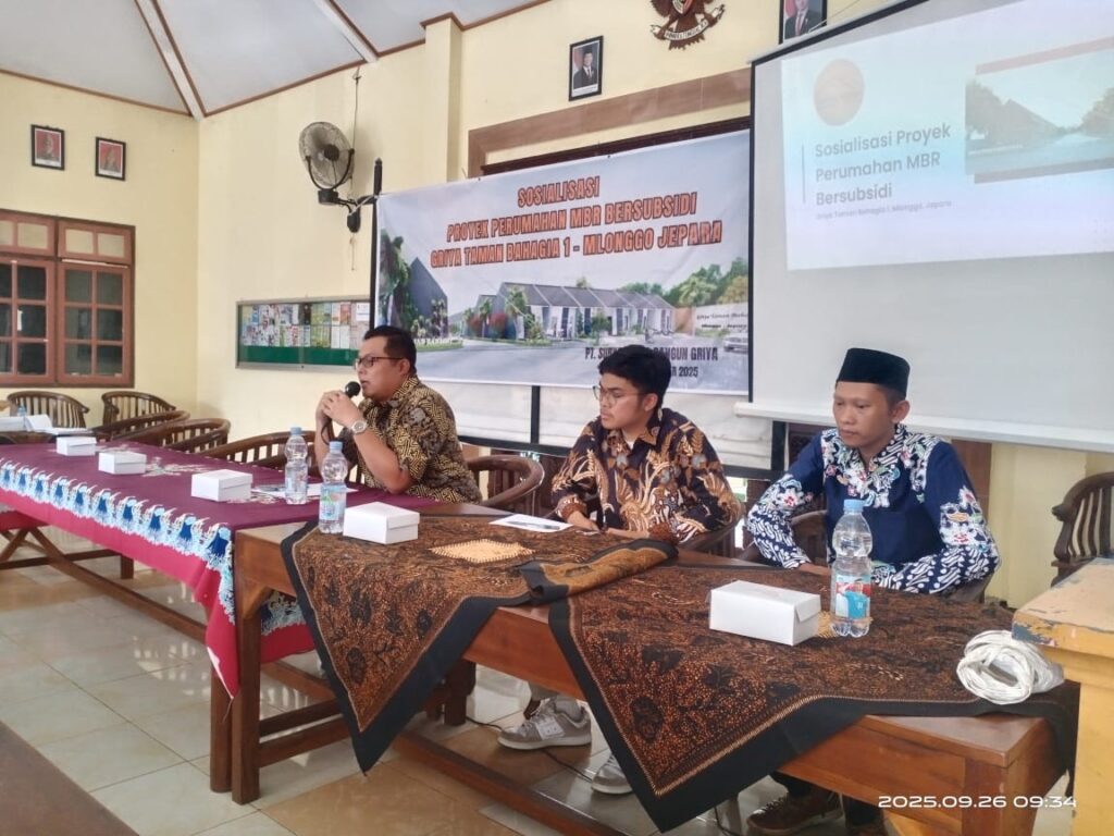 “Hari ini kami melakukan sosialisasi program rumah MBR di pendopo Desa Karanggondang Kecamatan Mlonggo Kabupaten Jepara, dengan harapan lingkungan dan Pemerintah Desa Karanggondang mendukung penuh program rumah MBR.