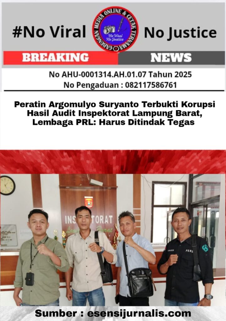 “Dan kami Lembaga Pembinaan Rakyat Lampung (PRL) sangat mengapresiasi terhadap kinerja Inspektorat Kabupaten Lampung Barat dalam pelaksanaan kegiatan pemeriksaan terhadap indikasi penyimpangan Anggaran Dana Desa pekon Argomulyo, Kecamatan Batu ketulis Kabupaten Lampung Barat.