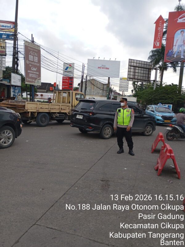 Suara62.id || Cikupa, Tangerang — Personel Polsek Cikupa Polresta Tangerang melaksanakan kegiatan pengaturan arus lalu lintas di Perempatan Lampu Merah Cikupa Mas, Jumat (13/2/2026).