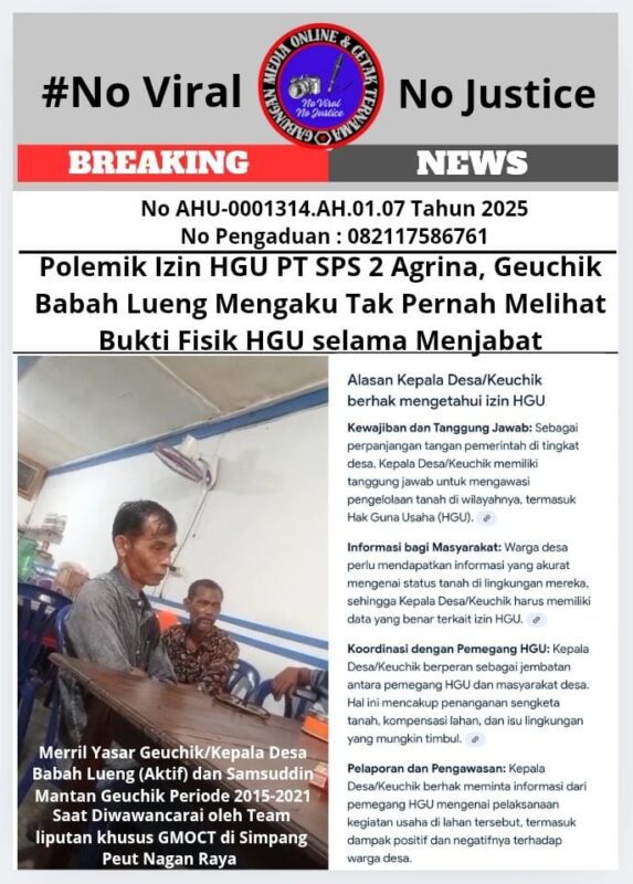 Suara62.id || Nagan Raya, Aceh (GMOCT) – Polemik terkait izin Hak Guna Usaha (HGU) PT SPS 2 Agrina di Desa Babah Lueng, Kecamatan Tripa Makmur, Kabupaten Nagan Raya, Aceh, semakin mencuat. Dua Geuchik (Kepala Desa) Babah Lueng, baik yang masih aktif maupun mantan, menyatakan tidak pernah melihat bukti fisik izin HGU yang diklaim oleh perusahaan tersebut.
