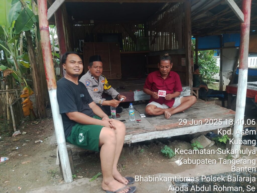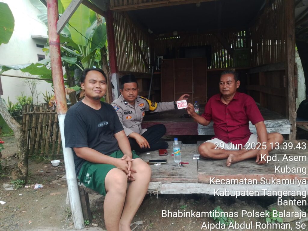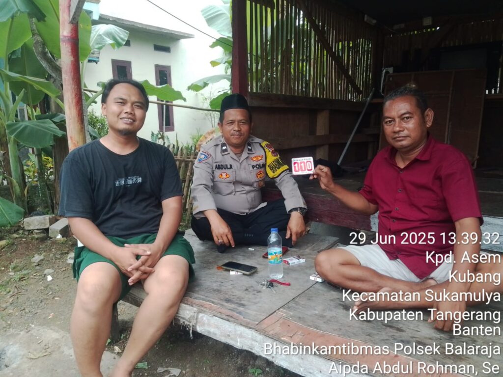 Suara62.id || Tangerang – Dalam rangka menjaga kemitraan dan kerja sama dengan Tokoh Masyarakat dan Warga Binaan, Bhabinkamtibmas Aipda Abdul Rohman SE dari Polsek Balaraja melaksanakan Sambang DDS Skaligus Sosialisasi Layanan Kepolisian 110 kepada Tokoh Masyarakat Bpk Eman dan Warga binaan di Kp Kubang Asem RT 03/02 Desa Kubang Kecamatan Balaraja Kabupaten Tangerang. (30/06/2025).