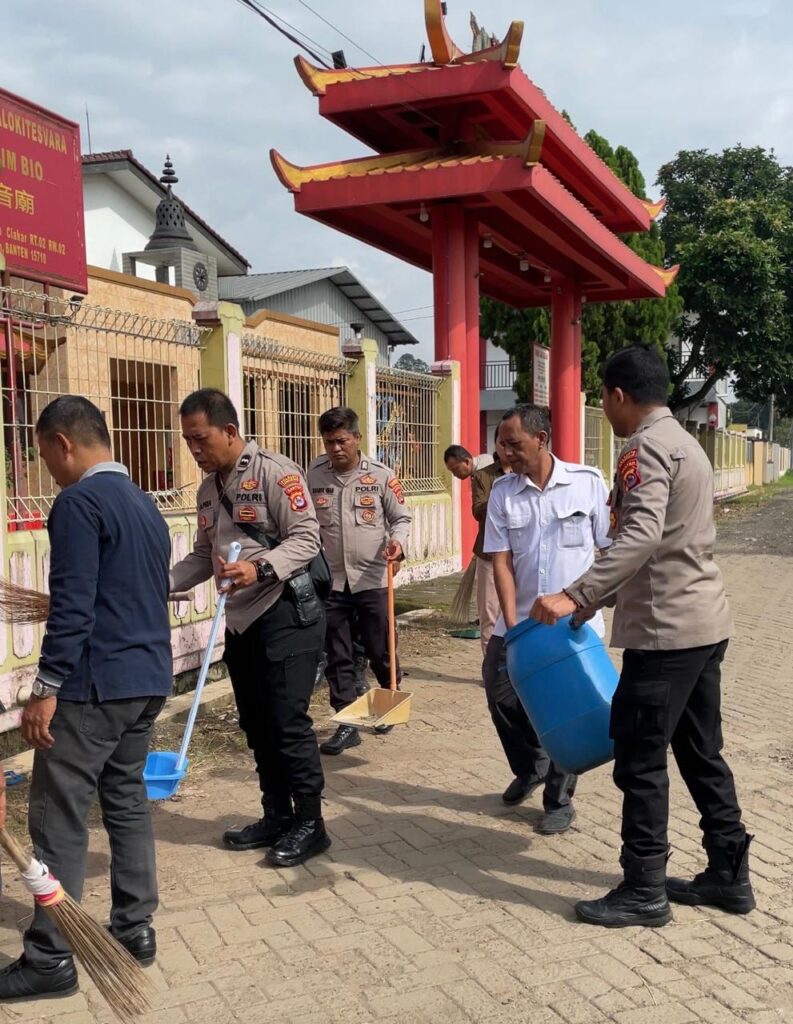 Sejak pagi hari, personel Polsek Panongan bersama pengurus vihara dan warga sekitar tampak bergotong royong membersihkan area halaman, merapikan taman, mengangkat sampah, serta membersihkan saluran air di sekitar tempat ibadah. Suasana penuh kebersamaan terlihat jelas dalam kegiatan yang bertujuan menciptakan lingkungan yang aman, sehat, bersih, dan indah tersebut.