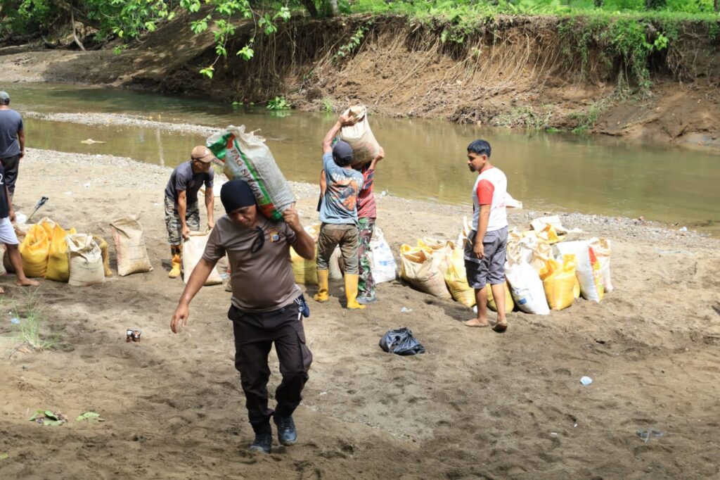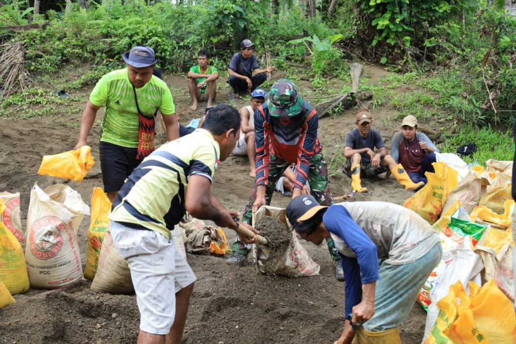 Kegiatan pengambilan pasir ini juga menjadi bukti nyata semangat gotong royong antara TNI dan masyarakat. Warga tampak antusias membantu personel Satgas mengangkut material dengan menggunakan karung, menunjukkan kekompakan dan kebersamaan dalam mendukung suksesnya program TMMD ke-126 di wilayah mereka.