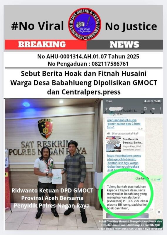 Suara62.id || Nagan Raya, Aceh 10 Oktober 2025 (GMOCT) – Gabungan Media Online dan Cetak Ternama (GMOCT) bersama Media Online Centralpers.press secara tegas menempuh jalur hukum dengan melaporkan seorang warga Desa Babahlueng, Husaini, ke Polres Nagan Raya pada Kamis (9/10/2025). Pelaporan ini dilakukan atas dugaan pencemaran nama baik dan penyebaran berita hoaks yang dinilai merugikan reputasi media dan profesi jurnalis.