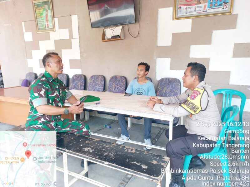 Suara62.id || Kabupaten Tangerang – Anggota Polsek Balaraja Aipda Guntur P. bersama Babinsa Serka Sunari melaksanakan Sambang DDS dan Silaturahmi kepada Tokoh Masyarakat dan Karang Taruna serta Warga binaan di Kantor Desa Gembong Kecamatan Balaraja Kab. Tangerang. Selasa (02/09/2025).