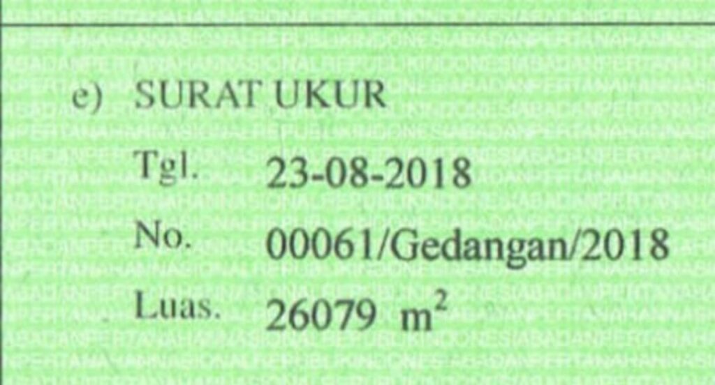 Berdasarkan data dan kutipan dokumen dari narasumber kami Ia memberikan informasi bahwa dokumen sertifikat yang dimiliki oleh Kementerian PU menyebutkan surat ukur tanggal 23 Agustus 2018 No. 00061/Gedangan/2018 seluas 26079 M2.
