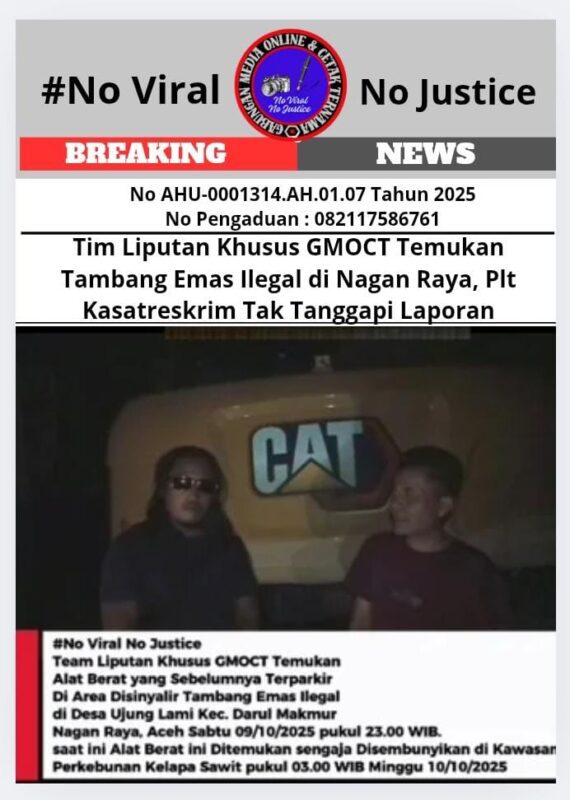 Suara62.id || Nagan Raya, Aceh (GMOCT) – Tim liputan khusus GMOCT menemukan sebuah alat berat yang terparkir di area yang diduga sebagai lokasi tambang emas ilegal di Desa Ujung Lami, Kecamatan Darul Makmur, Nagan Raya, pada Sabtu, 9 Oktober 2025, pukul 23.00 WIB.