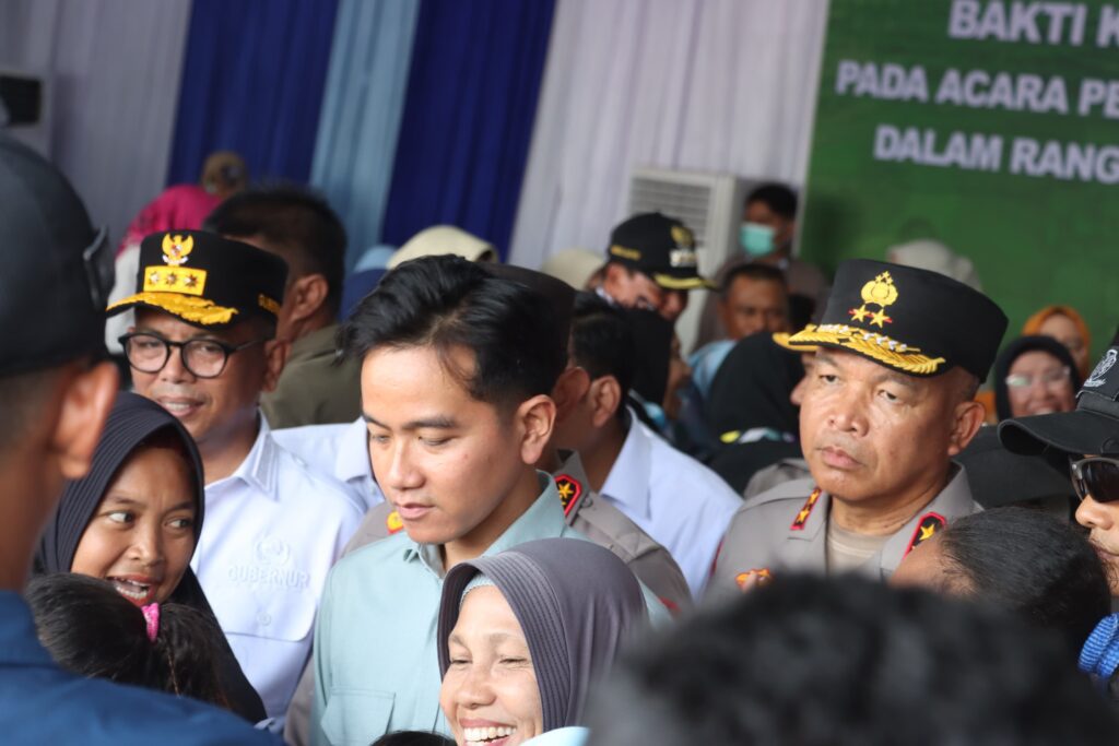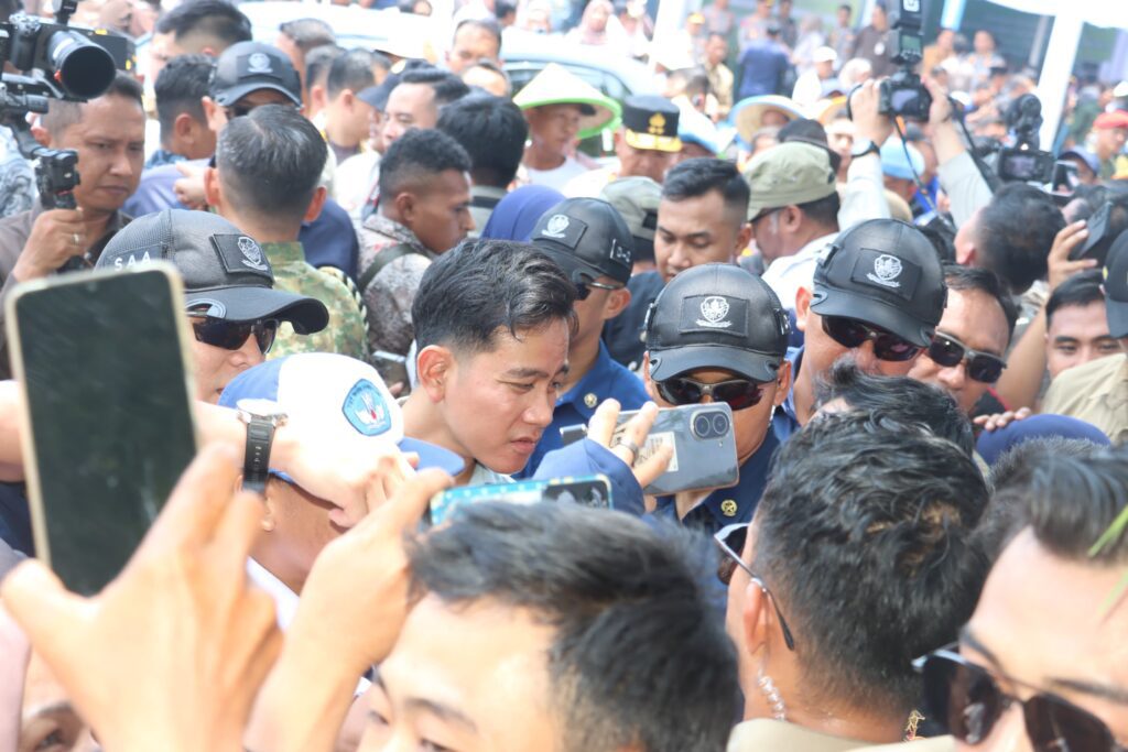 Kedatangan orang nomor dua di Republik Indonesia itu pun disambut antusiasme warga. Terpantau ribuan warga tumpah ruah di sekitar lokasi acara. Mulai dari pria, wanita, tua, muda, hingga anak-anak menyambut kedatangan Gibran.